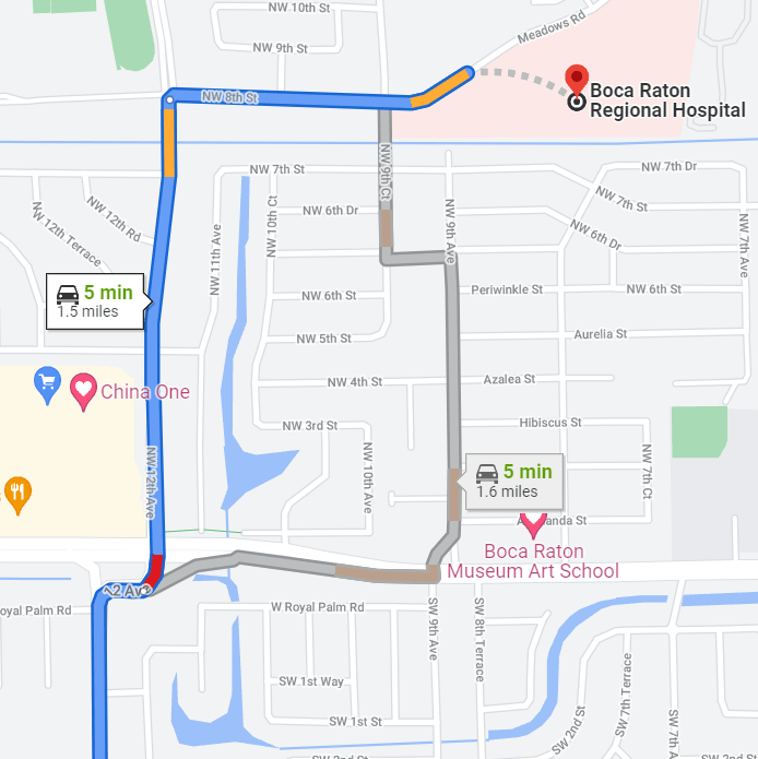 The hospital, Boca Raton Regional, is about 5 minutes away – if I hit all the lights. Your first house is very close to the hospital. On the way home daddy is ordering Chinese takeout.