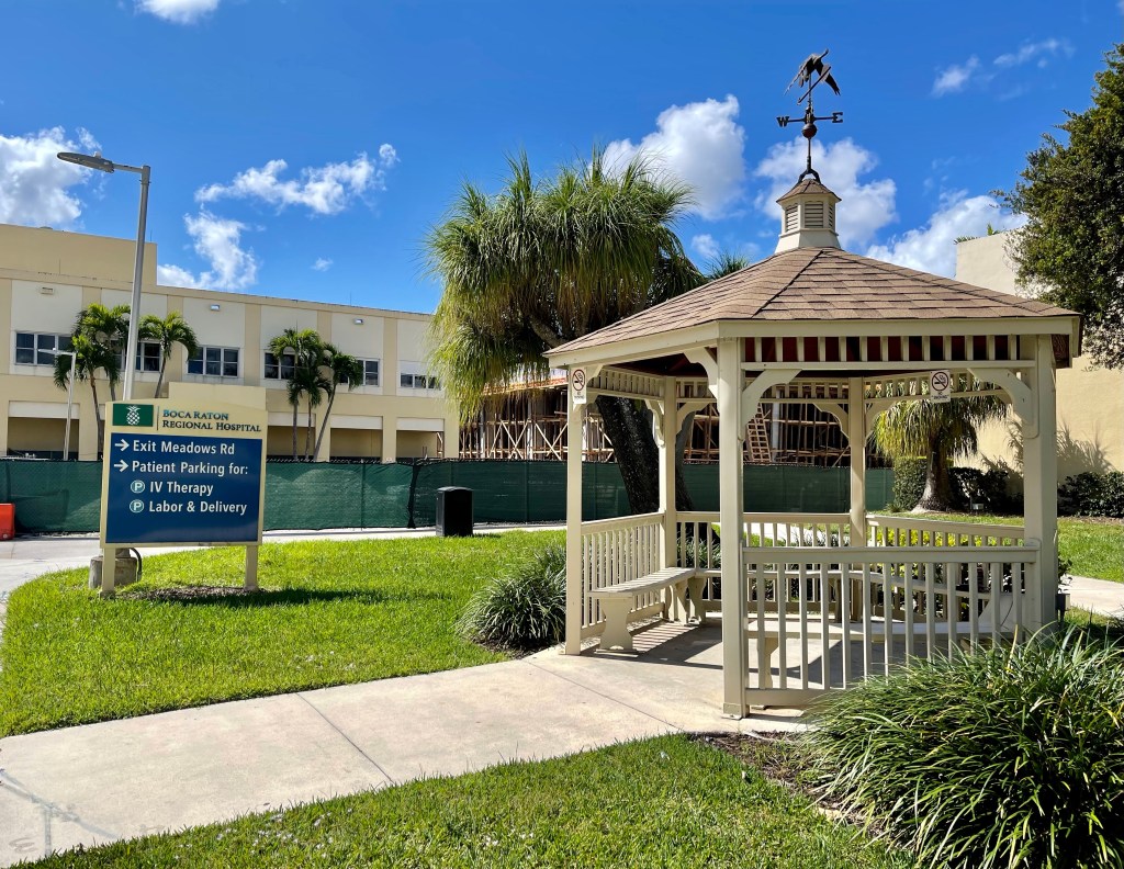 There is a gazebo outside for me to sit at while I wait. It’s is 78 and sunny in Florida today, and oddly, it smells like fried chicken – so I’m good.